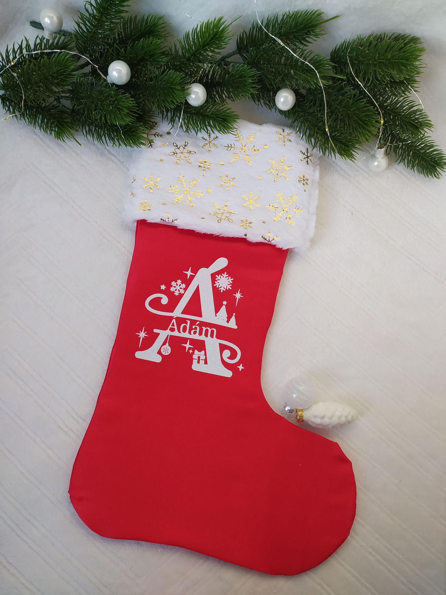 Névvel feliratozott mikulás csizma, zokni, piros-hópelyhes