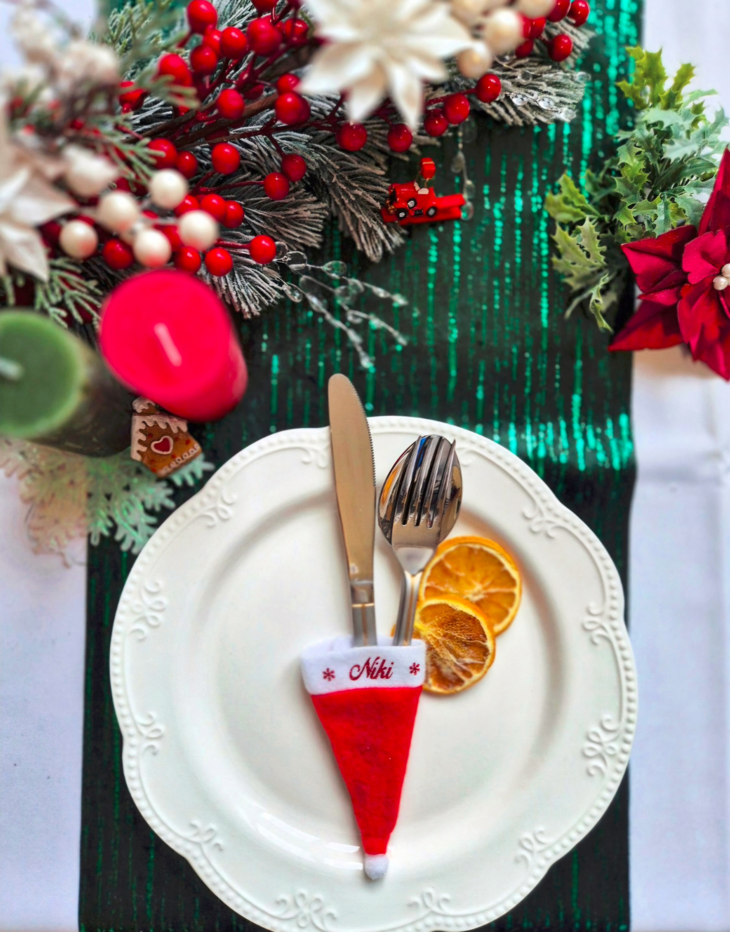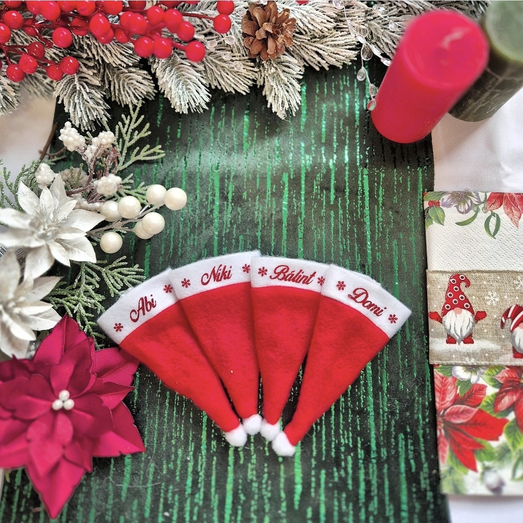 Filc anyagból készült pici mikulássapkák, amelyek evőeszköztartóként