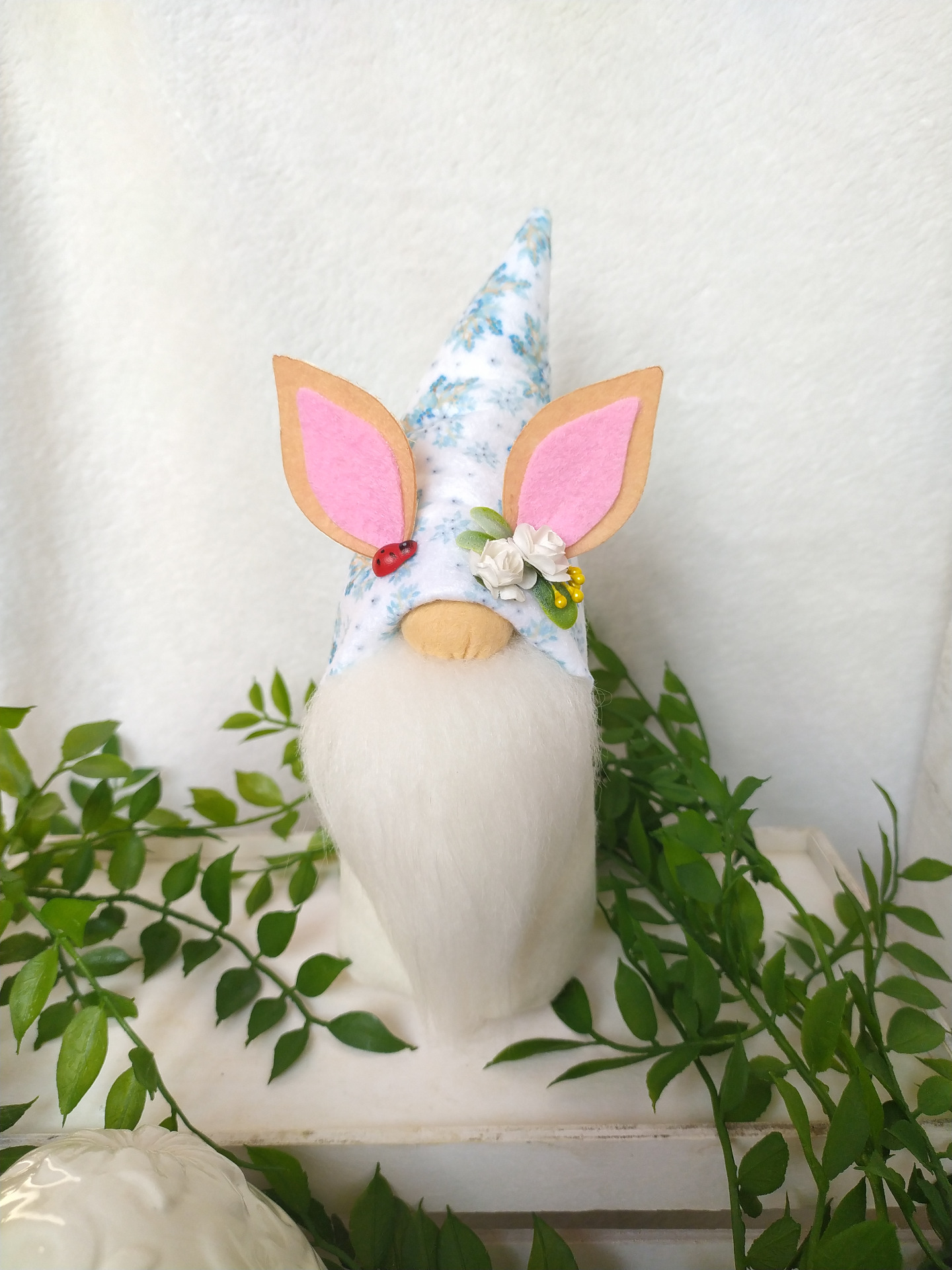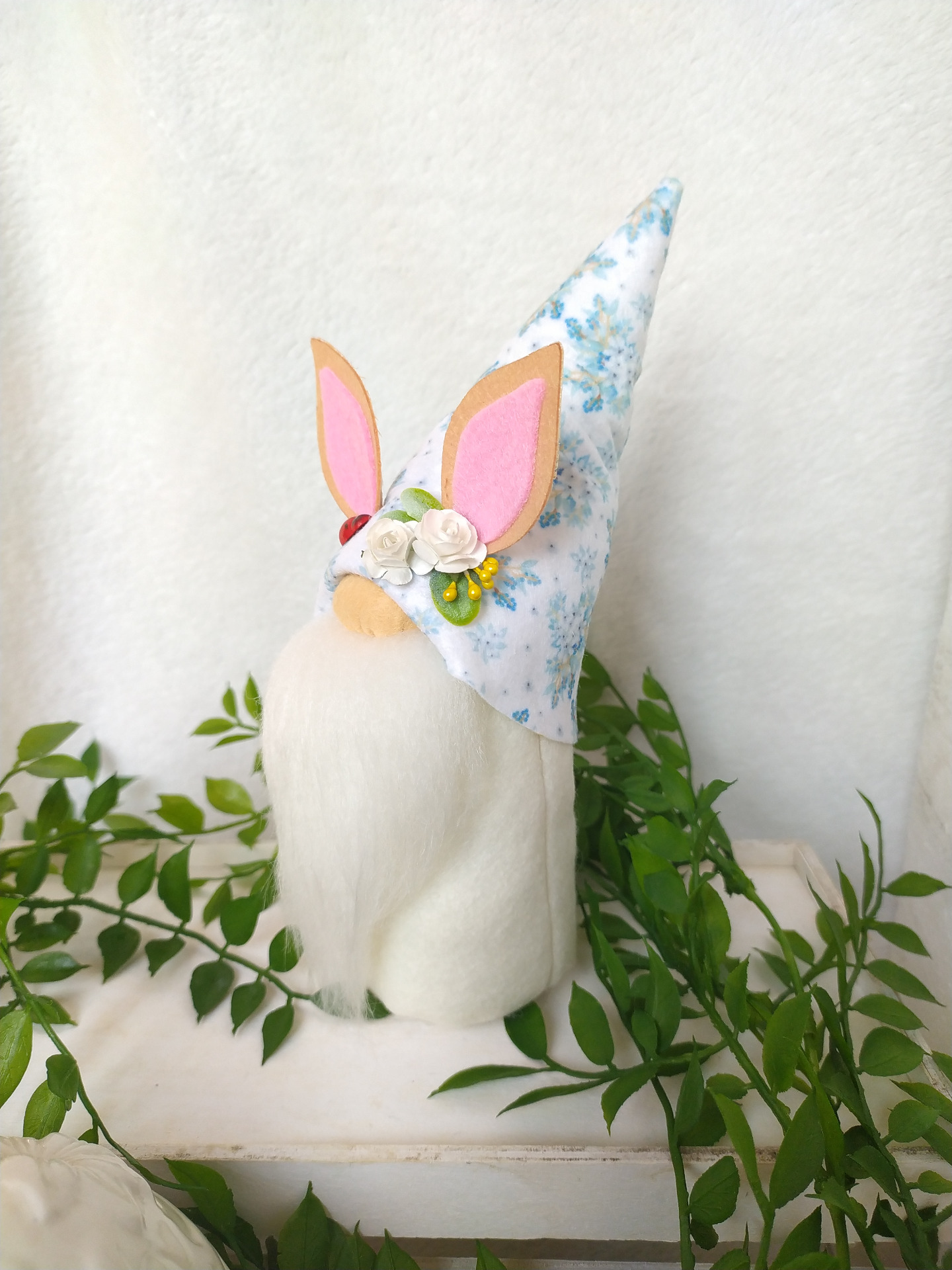 Virágmintás filcből készítettem tavaszi hangulatú manót nyuszifüllel :) Így húsvéti dekorációba is remekül illik.