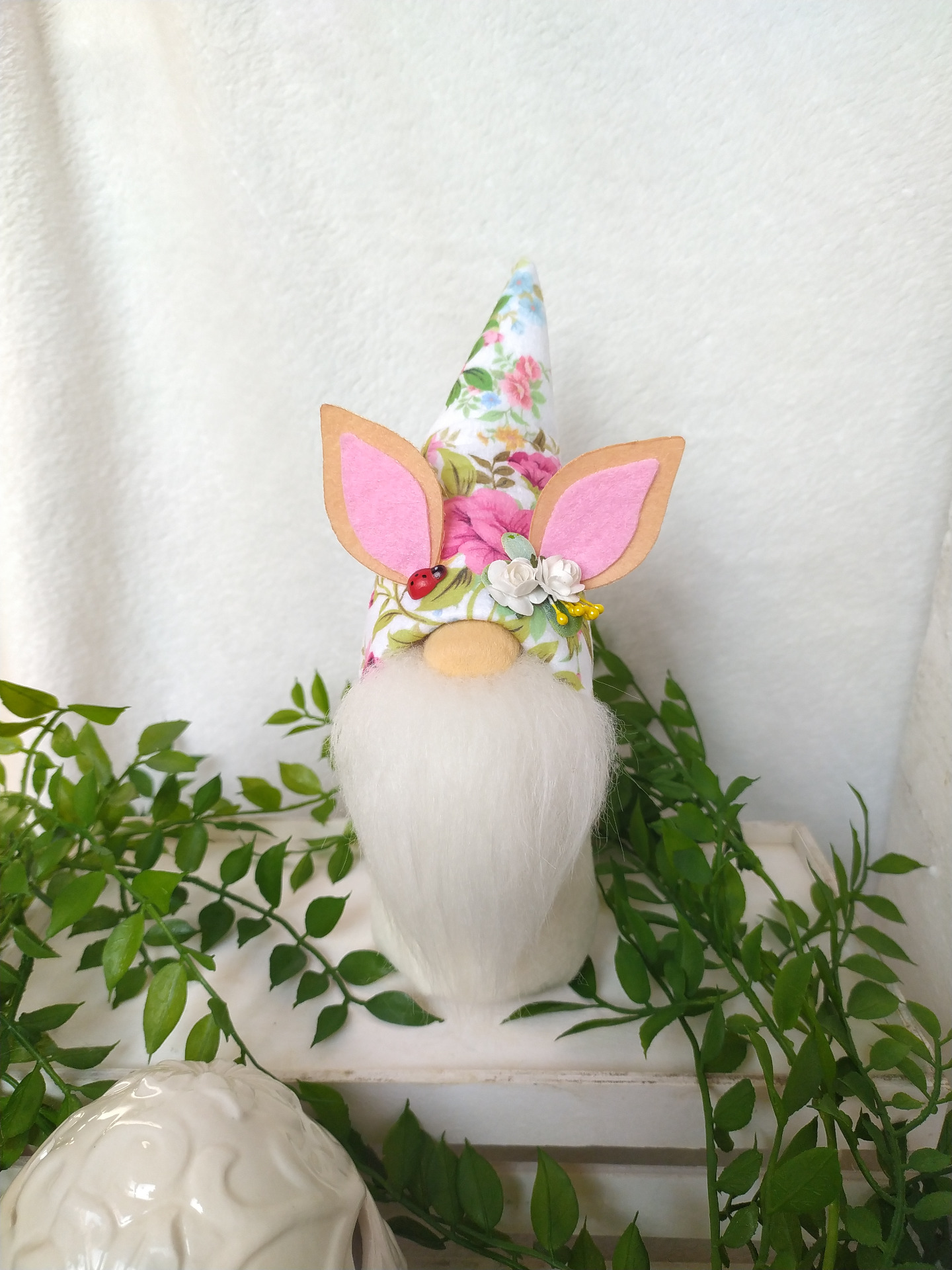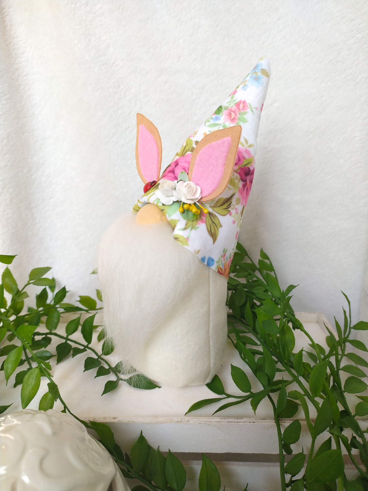 Virágmintás filcből készítettem tavaszi hangulatú manót nyuszifüllel :) Így húsvéti dekorációba is remekül illik.